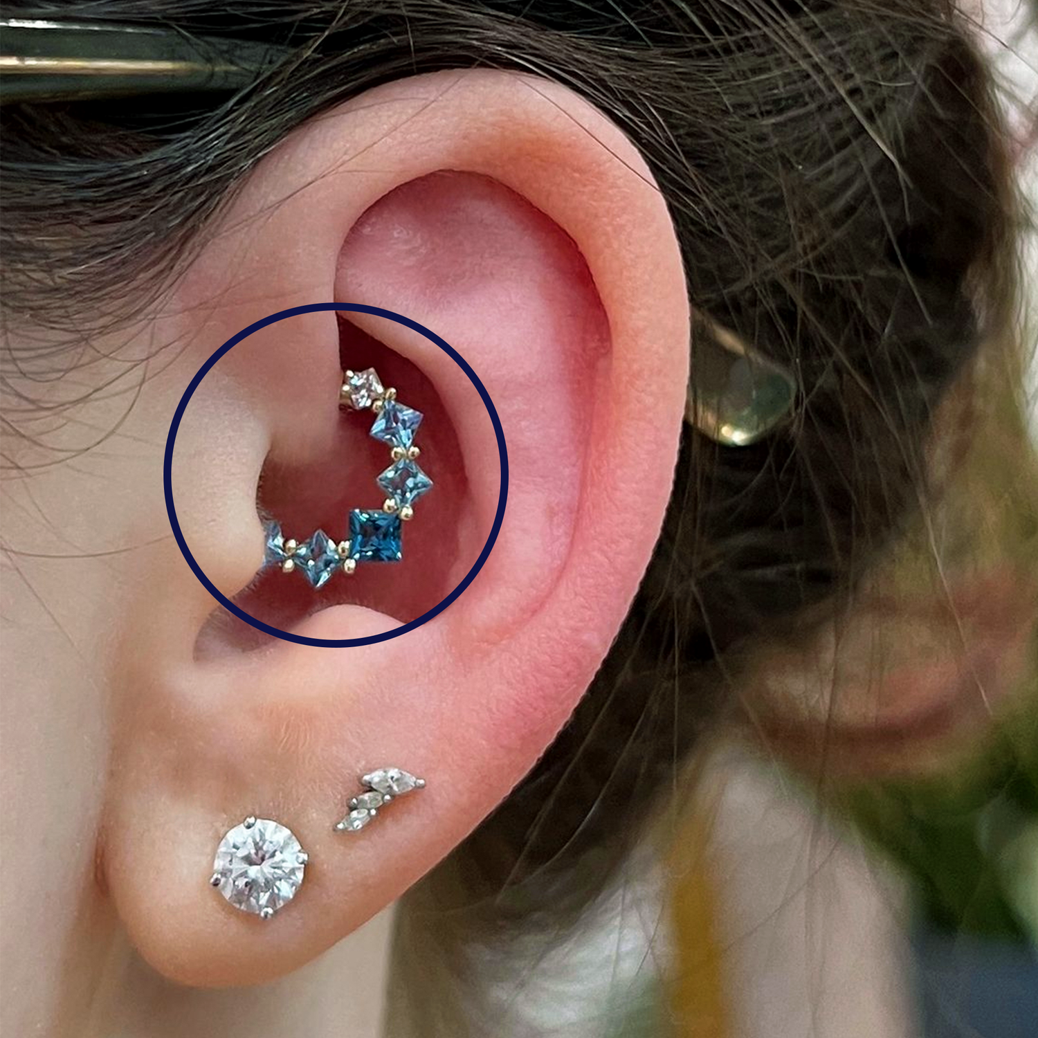 A daith piercing is a type of ear piercing that goes through the innermost cartilage fold of the ear.