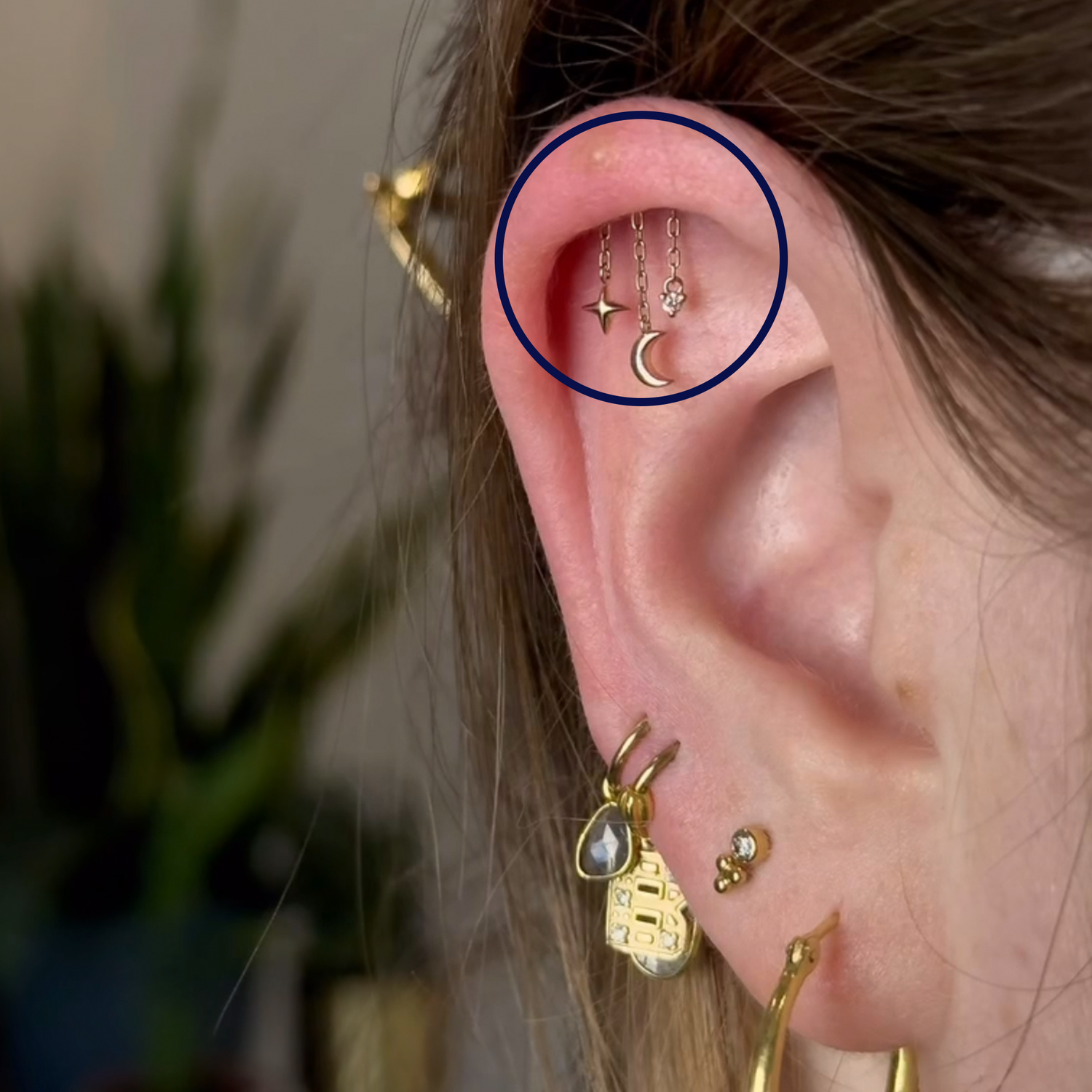 A hidden helix piercing is a type of ear piercing that involves the upper cartilage of the outer rim of the ear, but tucked underneath the top fold of your ear.