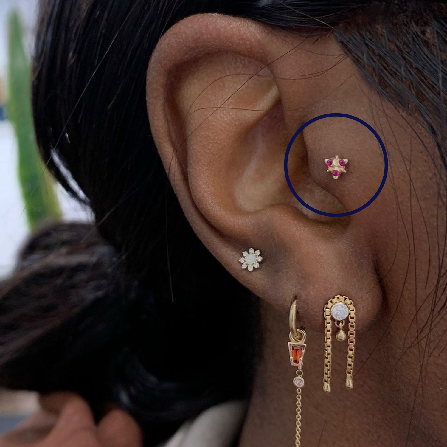 A tragus piercing involves perforating the small, cartilage prominence located just in front of the ear canal, known as the tragus.