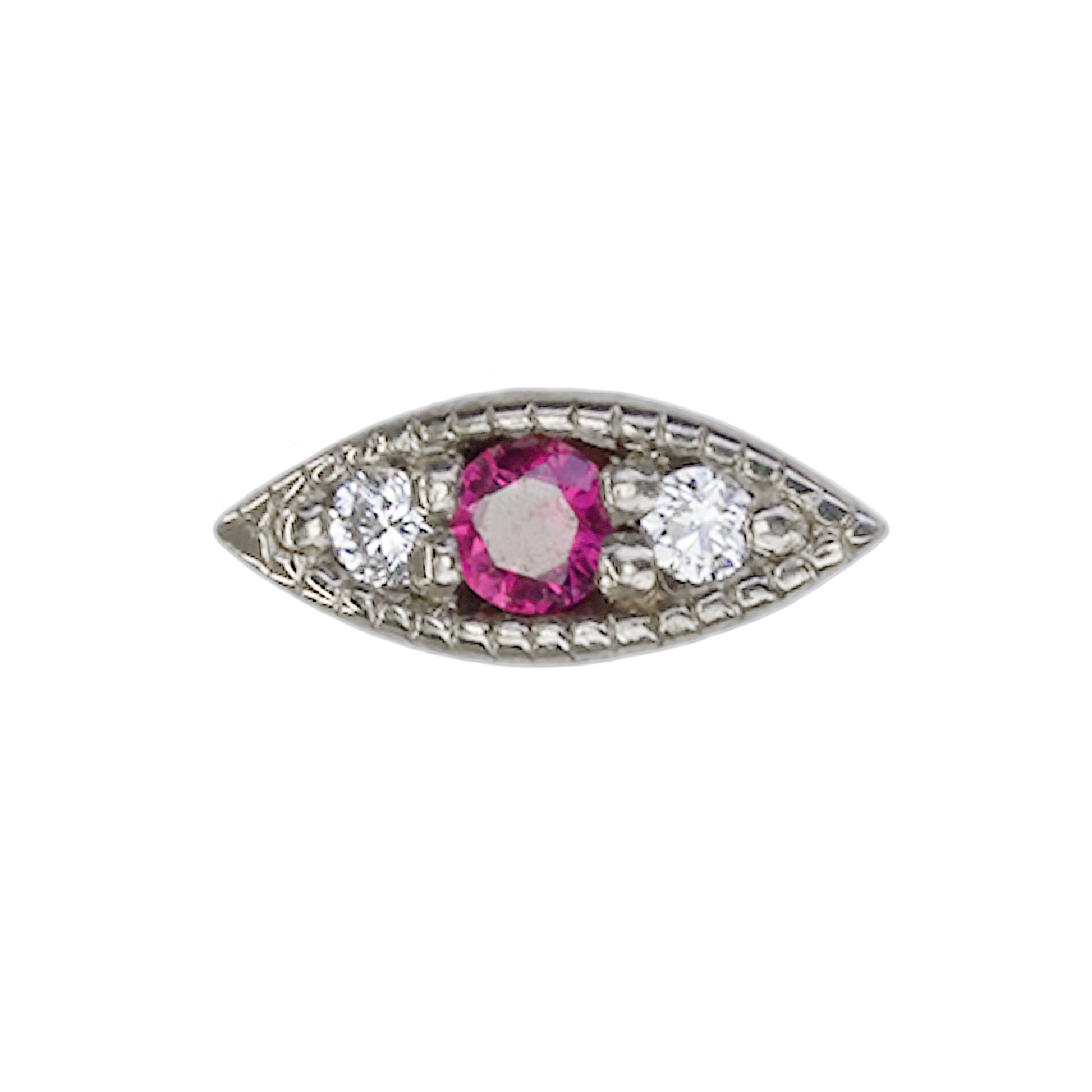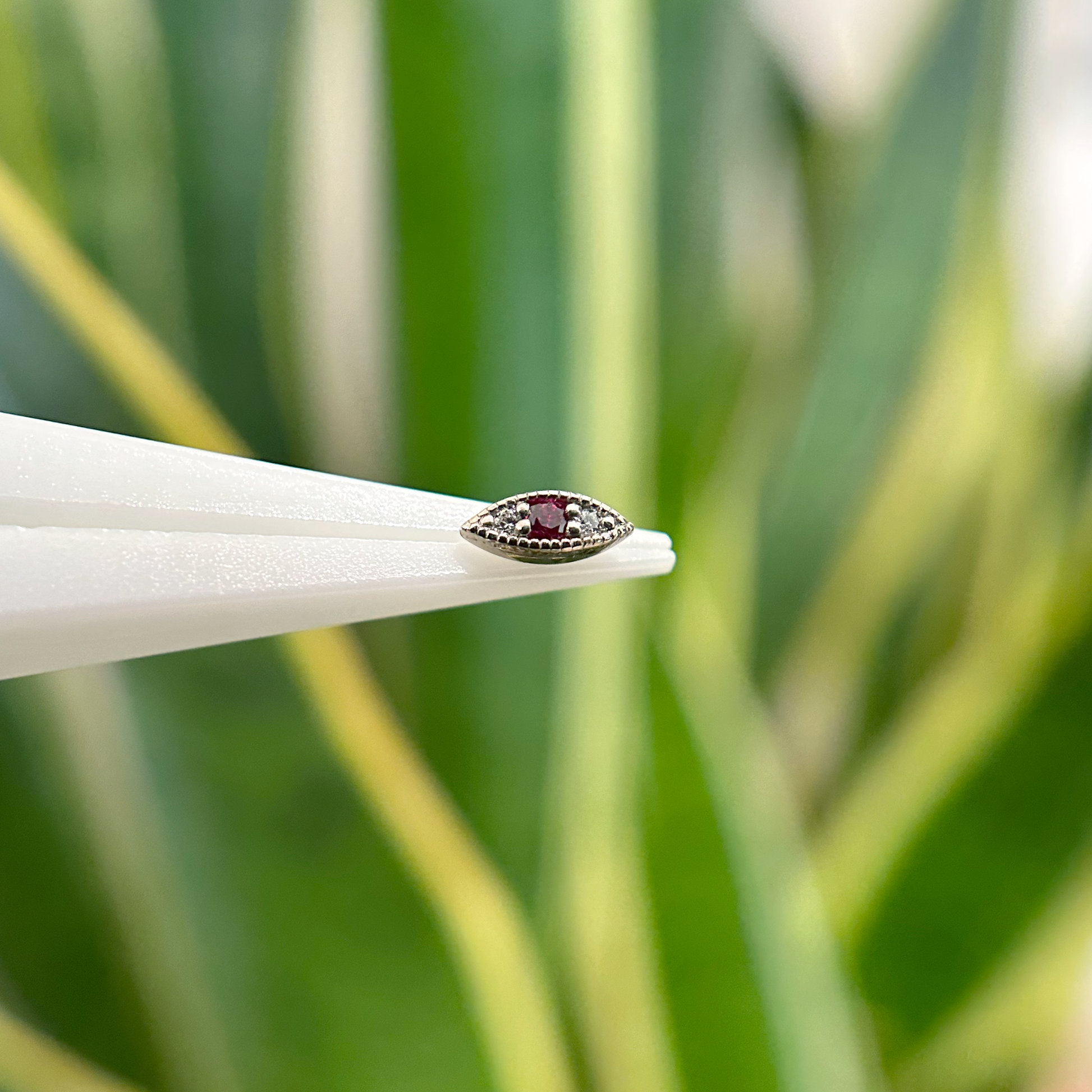 From Local Natives, this Pea Pod threadless end is marquise shaped and lined with diamonds and a ruby.