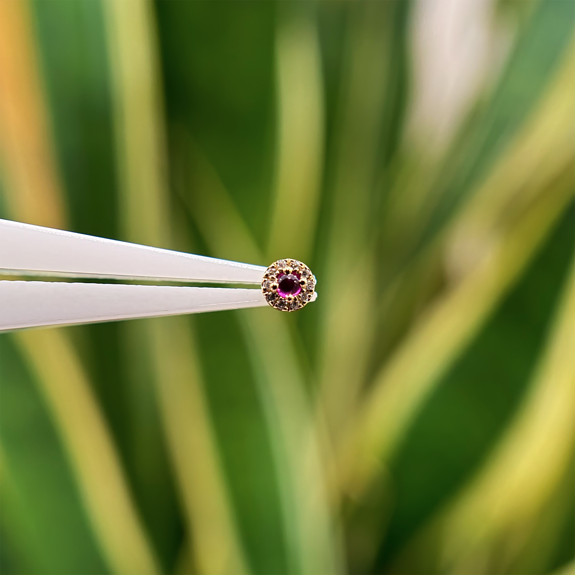 New in from Modern Mood! This 3mm threadless end features a 1.5mm ruby cabochon surrounded by a white diamond halo.
