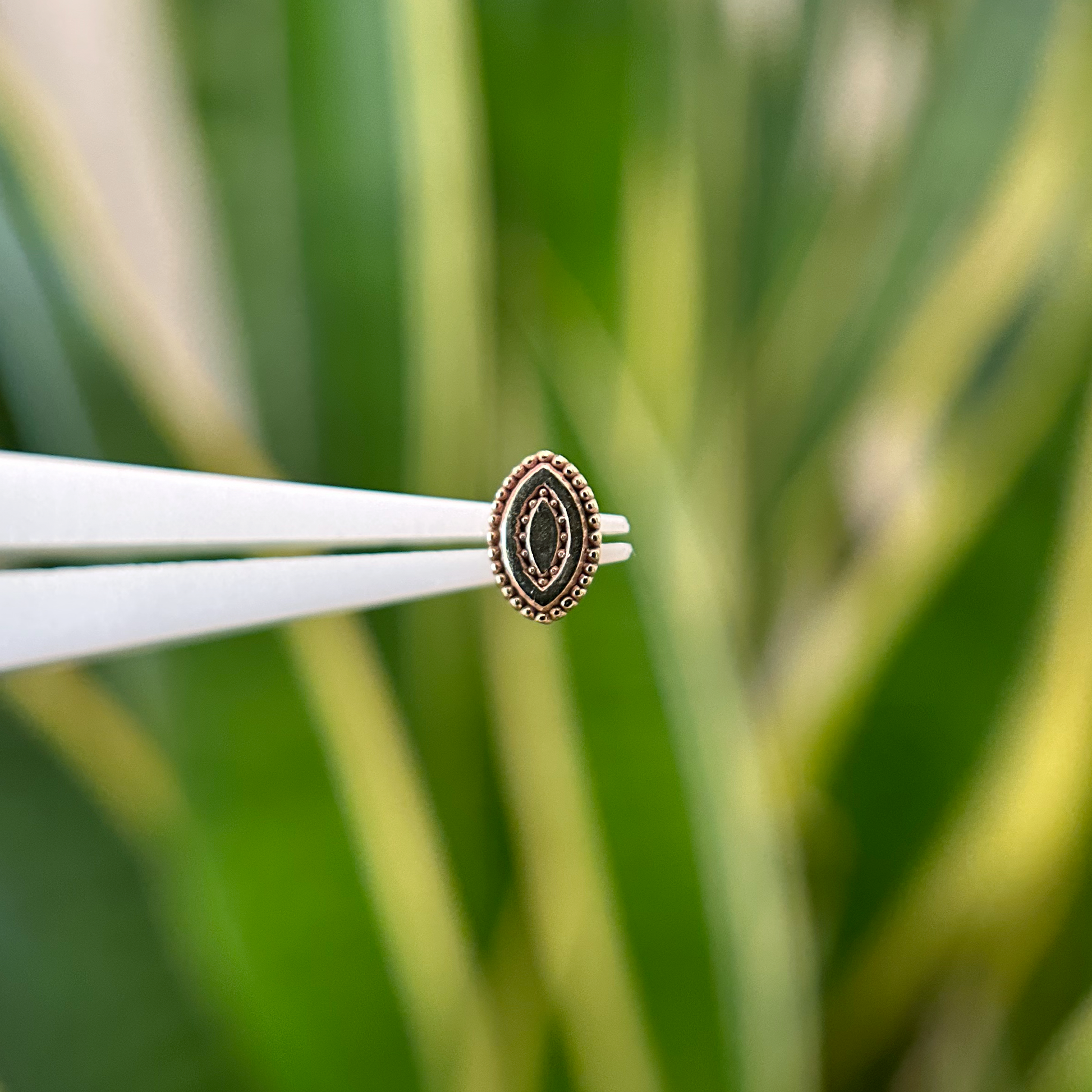 From Sacred Symbols, this solid gold marquise-shaped threadless end is adorned with beaded details.