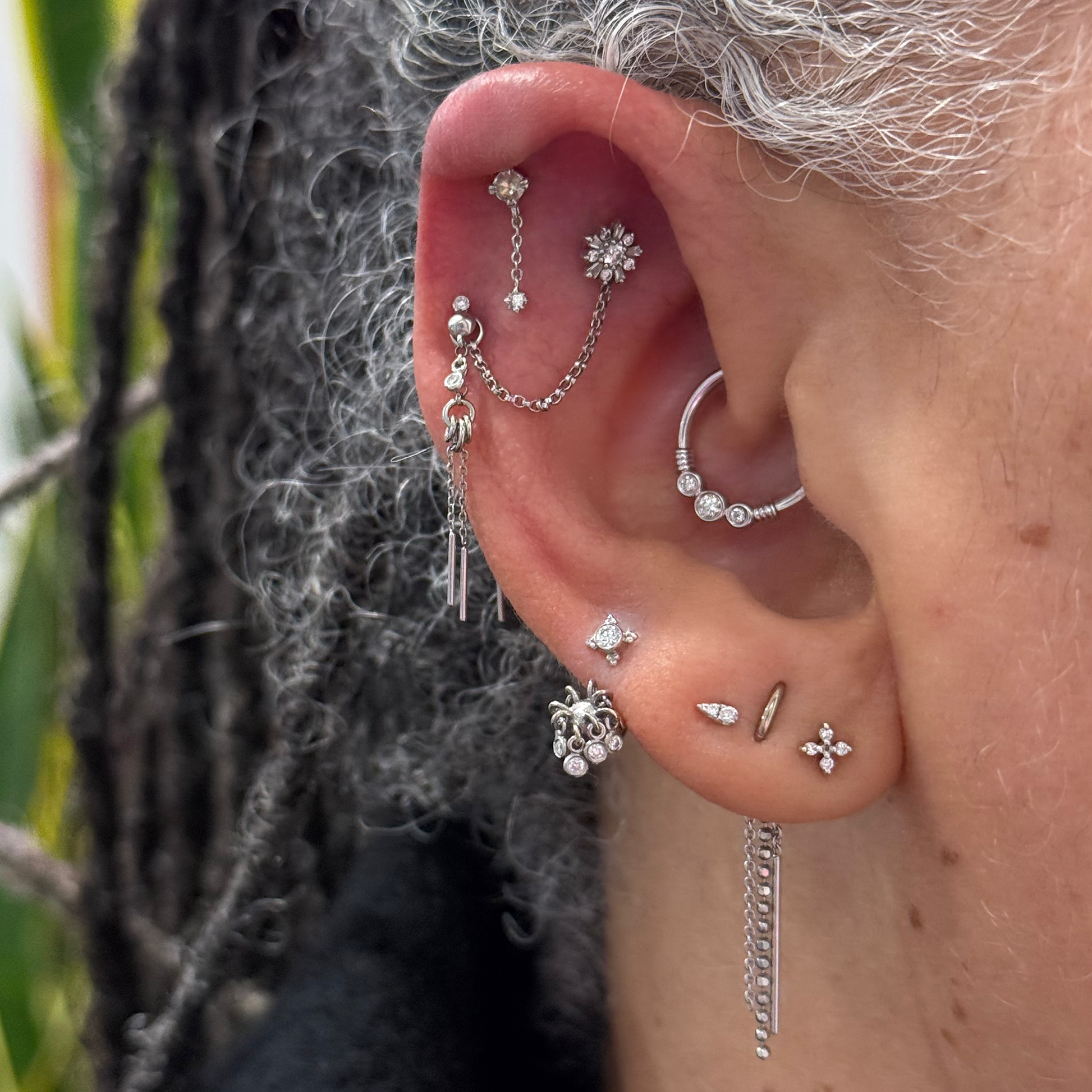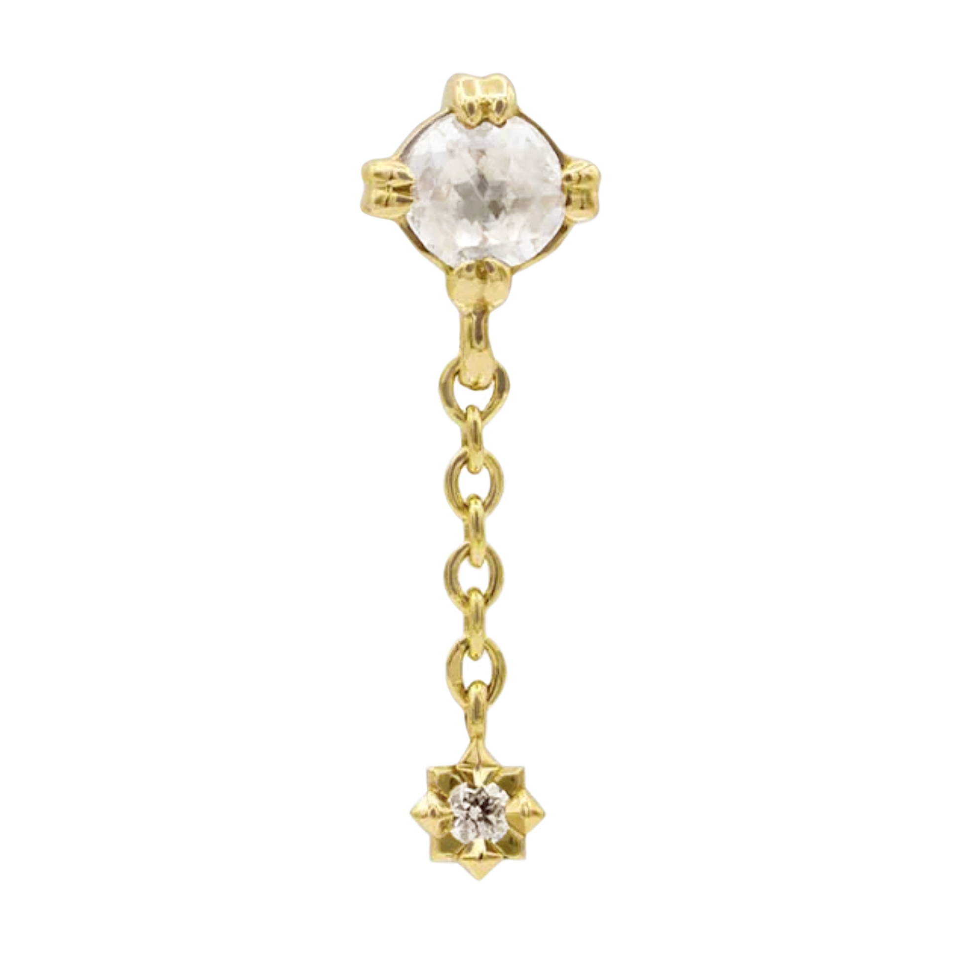 From Tether, the Divine threadless end showcases a 2.5mm rose-cut diamond top with a 1mm star-set diamond at the bottom of a chain drop.